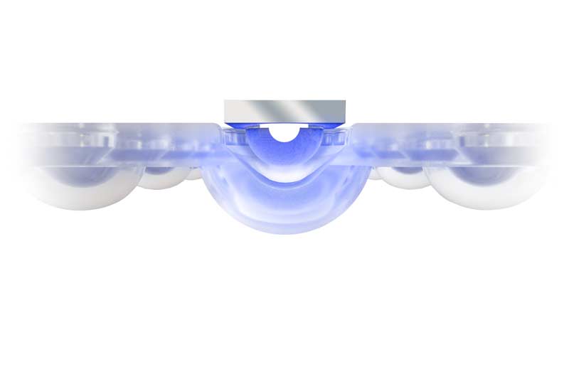 The improvement was achievable through a change to the primary optic on the LEDs which then integrates with the geometry in the existing HEI (Hemispherically Edge Illuminating) secondary optic (lens).