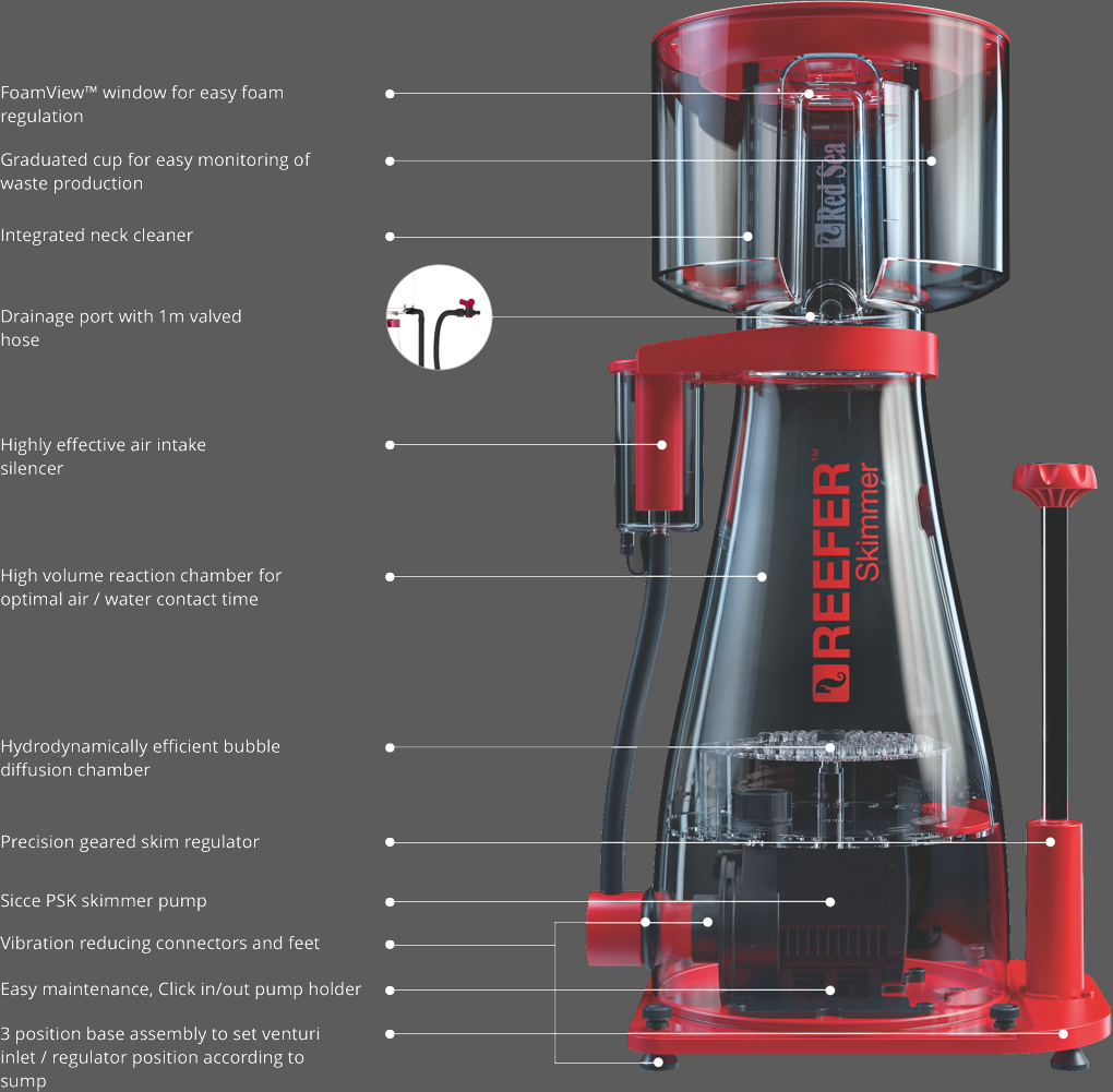 Designed with hobbyists needs in mind, the REEFER™ Skimmers are really quiet thanks to rubber connectors which dampen the vibrations as well as a robust air silencer. With features like the FoamView™ window, built-in neck cleaner and extra-long valved waste tube, we guarantee an enhanced home reef filtration experience.